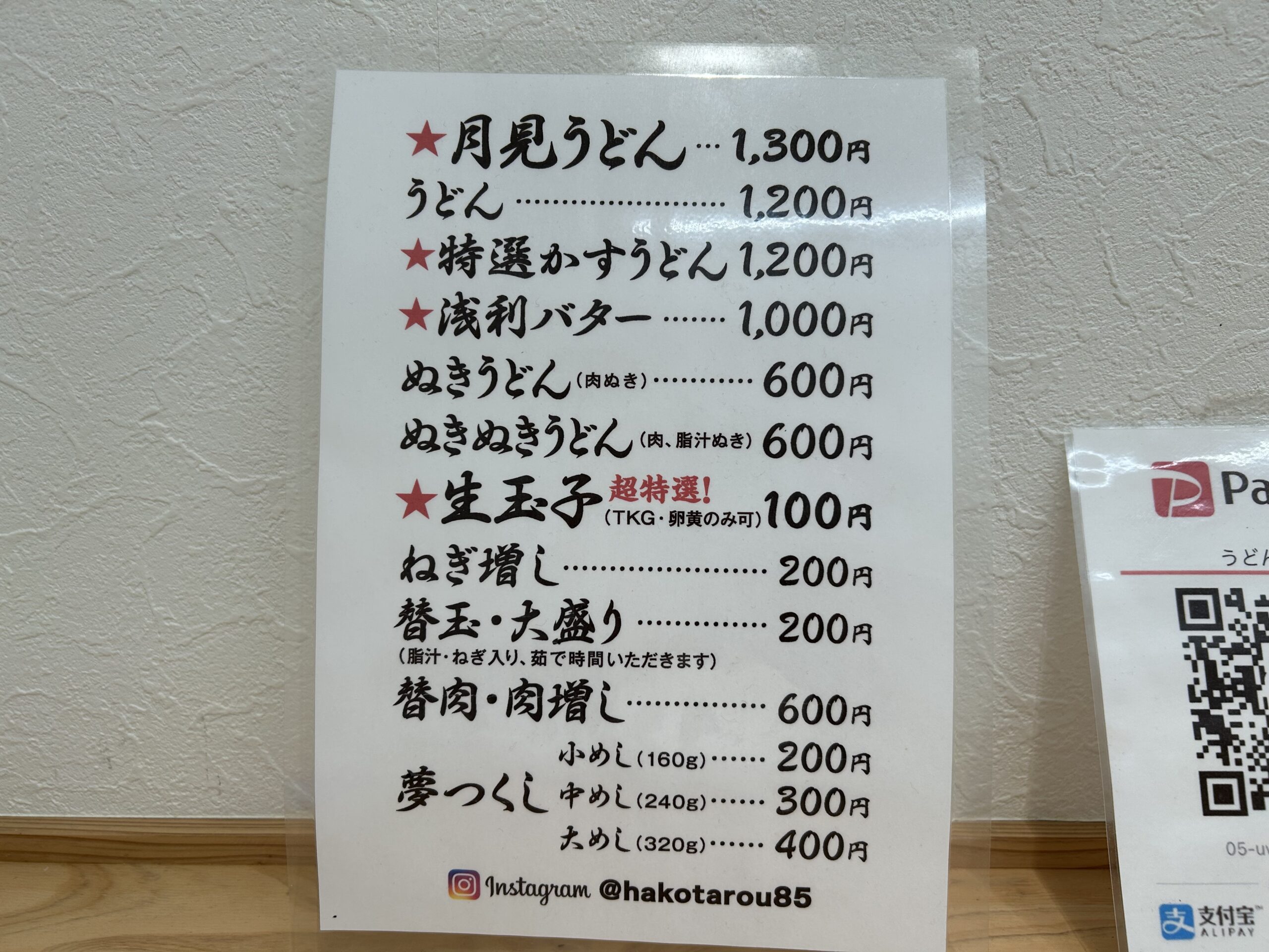 「うどん 箱太郎」のメニューはこちら。(※価格は2025年11月時点のものになります。)