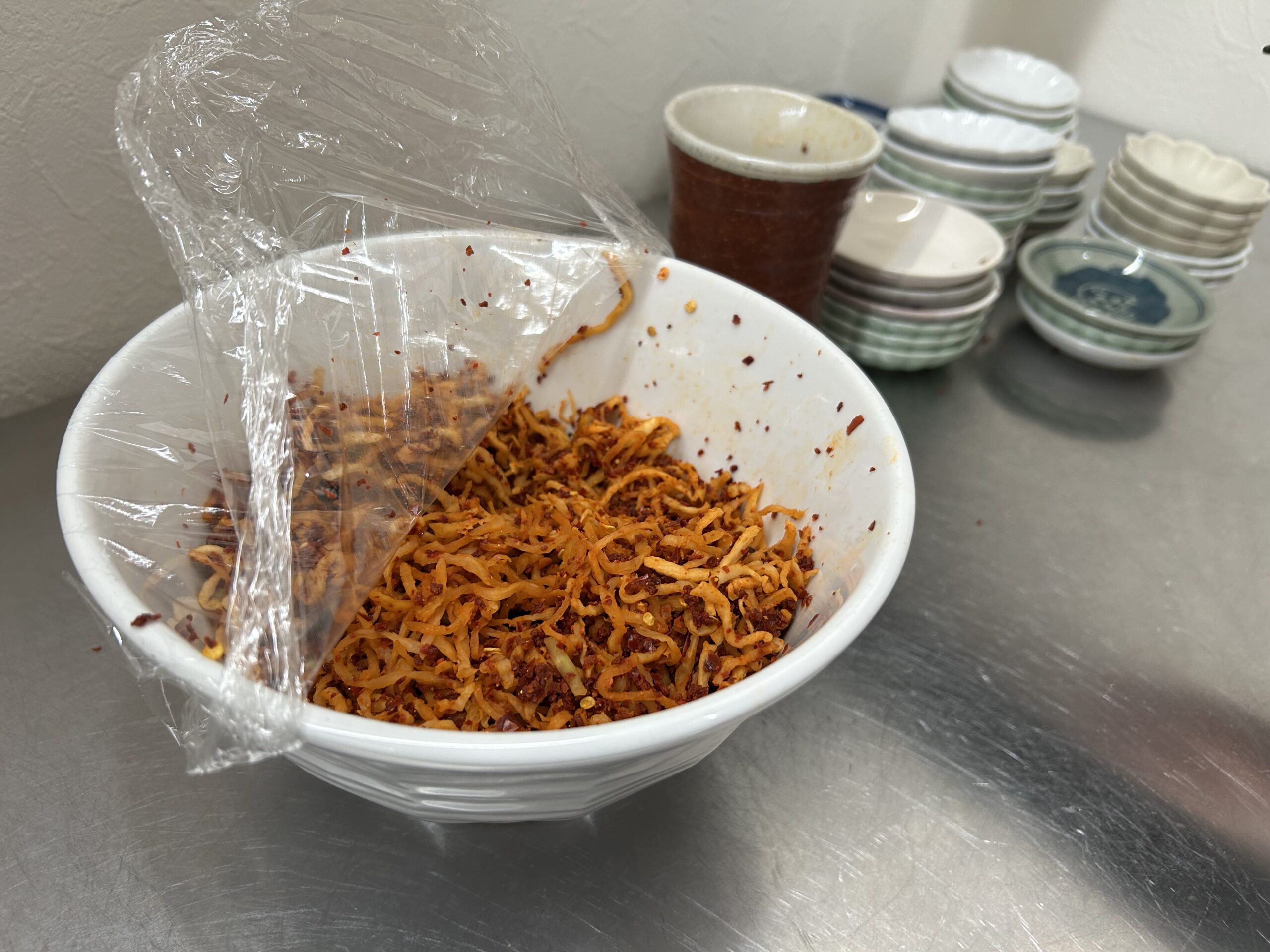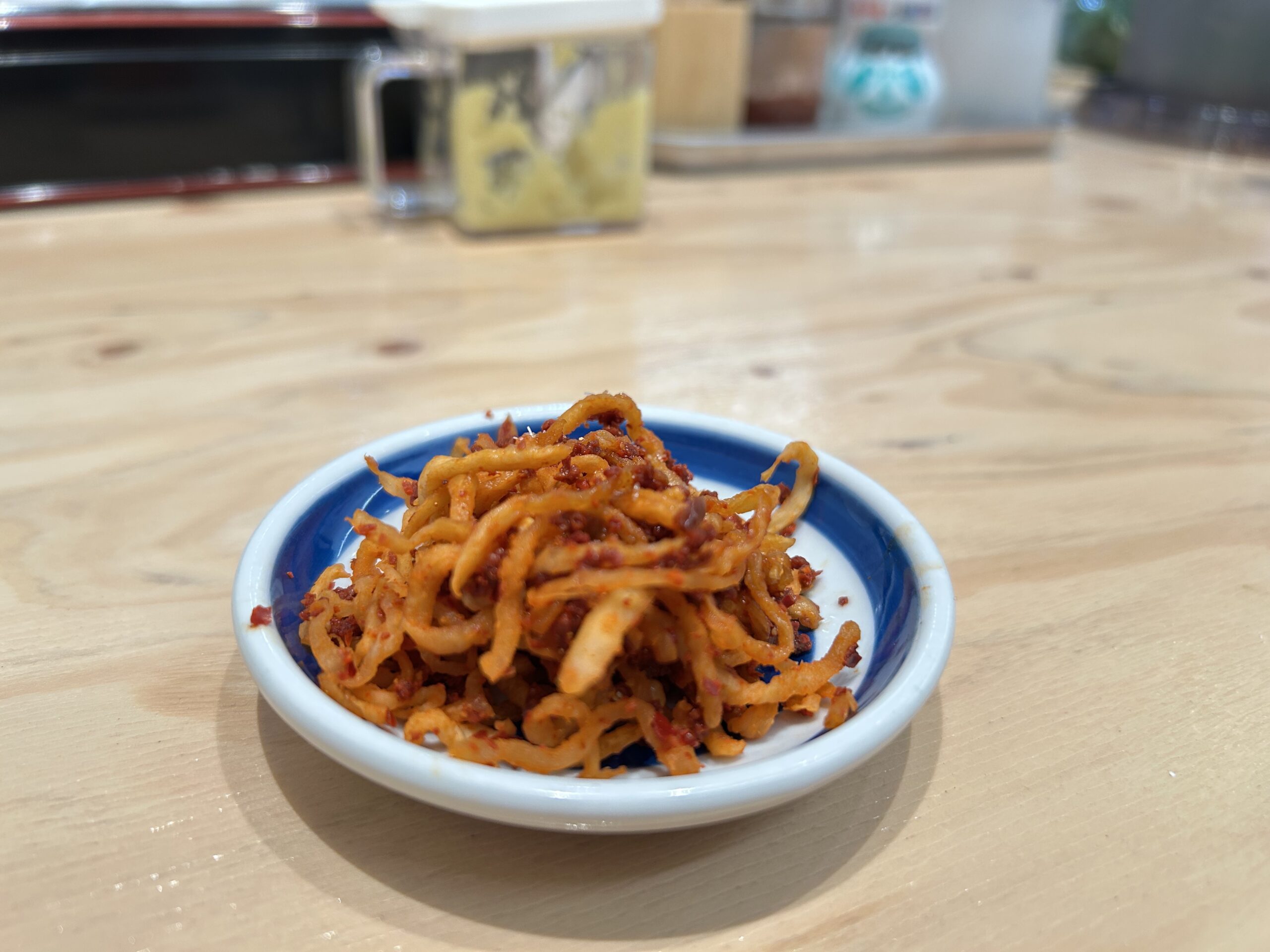 味の素と醤油をかけて食べるのがおすすめだそうで、食べてみると見た目通り結構辛い!けど、うまい!