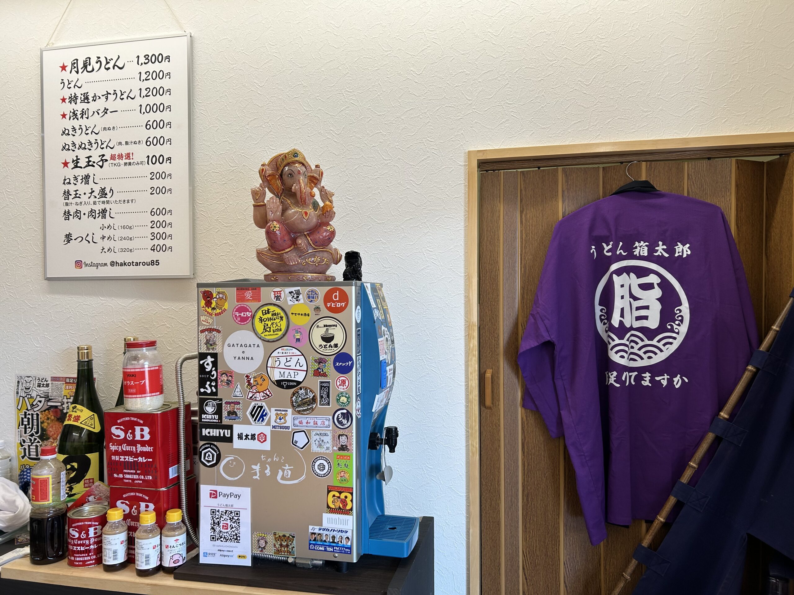 水はセルフサービス。うどんMAPをはじめ、いろんなインパクトのあるステッカーで溢れています!